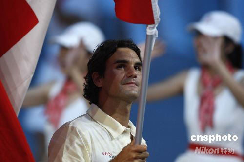 8月8日,第29屆夏季奧運會在北京奧林匹克公園內(nèi)的國家體育場“鳥巢”開幕。各個奧運代表團的旗手都是該國的體育明星。圖為瑞士奧運代表團旗手“網(wǎng)球天王”費德勒。 中新社發(fā) 杜洋 攝