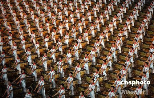 第二十九屆夏季奧運(yùn)會(huì)8月8日晚在北京奧林匹克公園內(nèi)的國(guó)家體育場(chǎng)舉行開幕式,由一千多面“戰(zhàn)鼓”組成的盛大陣容歡迎各地嘉賓。中新社發(fā) 任晨鳴 攝