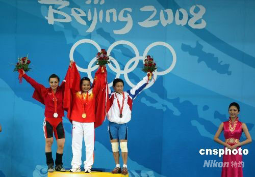 8月9日上午,中國舉重選手陳燮霞在北京奧運會女子舉重48公斤級決賽中以總成績212公斤打破奧運會記錄,力壓各路群芳獲得冠軍,土耳其選手西貝爾·厄茲坎(OZKAN Sibel)獲得銀牌,中華臺北選手陳葦綾(右)獲得銅牌。中新社發(fā) 任晨鳴 攝
