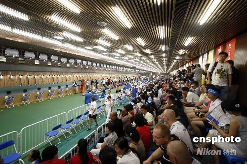 北京奧運(yùn)會(huì)射擊男子10米氣手槍資格賽在北京射擊館舉行,參賽的中國(guó)選手龐偉晉級(jí)決賽,老將譚宗亮發(fā)揮欠佳慘遭淘汰。圖為觀眾在賽場(chǎng)內(nèi)觀看比賽。中新社發(fā) 盛佳鵬 攝