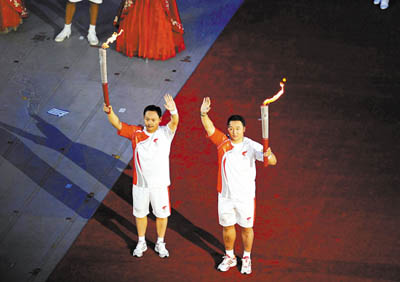 昨天下午給浙江舉重世界冠軍占旭剛打電話時,他不斷地說,晚上會很忙,沒空。沒想到,晚上的圣火點(diǎn)燃前,浙江兩屆奧運(yùn)舉重冠軍占旭剛出現(xiàn)在鳥巢里,在全場9萬多名觀眾面前第二次舉起了祥云火炬,原來他去忙這個了。