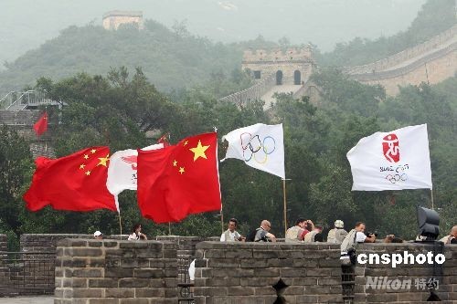 圖為奧運(yùn)旗幟在長(zhǎng)城上高高飄揚(yáng)。中新社發(fā) 武仲林 攝