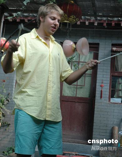 奧運會期間,北京將迎來四十五萬中外游客。圖為8月9日下午一美國青少年游覽北京金絲胡同的一座四合院時,學(xué)主人玩起了抖空竹游戲。 中新社發(fā) 王辛莉 攝