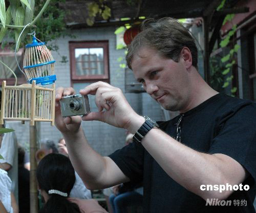 圖為奧地利游客8月9日下午游覽北京胡同的四合院時,對主人掛在院中竹籠里的蟈蟈蟲深感好奇。中新社發(fā) 王辛莉 攝