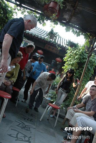 圖為奧地利游客8月9日下午游覽北京金絲胡同的四合院時(shí),觀賞主人在地上用水寫(xiě)的歡迎書(shū)法。 中新社發(fā) 王辛莉 攝