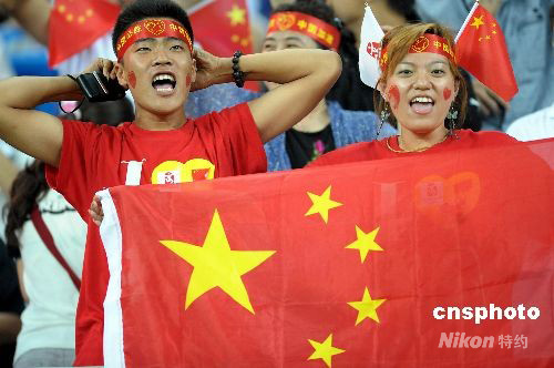 8月9日晚,中國(guó)女足在天津奧體中心水滴體育場(chǎng)與加拿大女足進(jìn)行奧運(yùn)第二場(chǎng)小組賽的較量,球迷在比賽現(xiàn)場(chǎng)為奧運(yùn)會(huì)女足比賽加油。 中新社發(fā) 陳文 攝