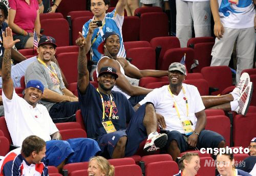 8月9日,美國總統(tǒng)布什一家來到五棵松體育館為美國女籃助威。同時(shí)前來為助威的美國男籃“夢八隊(duì)”的超級球星:詹姆斯、韋德、霍華德、安東尼等,向布什總統(tǒng)致敬。 中新社發(fā) 任晨鳴 攝