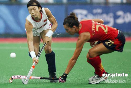 8月10日,中國女曲在北京奧運會女子曲棍球小組賽首場比賽中以3:0戰(zhàn)勝西班牙隊。圖為雙方球員展開激烈爭奪。中新社發(fā) 武仲林 攝