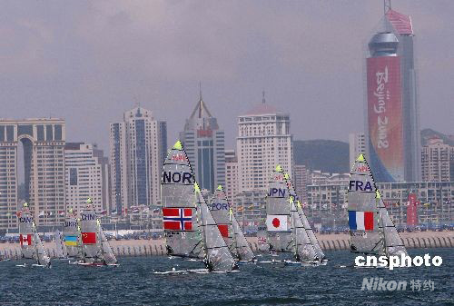 北京2008奧運帆船比賽8月10日繼續(xù)在青島舉行,各國的參賽帆船出發(fā)的場面成為一道風(fēng)景線。 中新社發(fā) 趙振清 攝