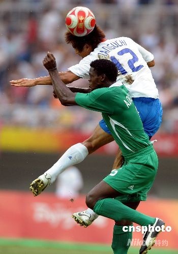 8月10日下午,在奧運(yùn)男足小組賽天津賽區(qū),日本男足0:2不敵尼日利亞隊(duì)。圖為日本隊(duì)12號(hào)谷口博之在爭(zhēng)頂。中新社發(fā) 陳文 攝