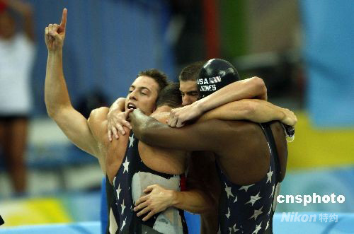 8月11日,美國(guó)隊(duì)奪得北京奧運(yùn)會(huì)男子4x100米自由泳接力險(xiǎn)勝法國(guó),奪得該項(xiàng)目的金牌,并打破世界紀(jì)錄。 中新社發(fā) 杜洋 攝