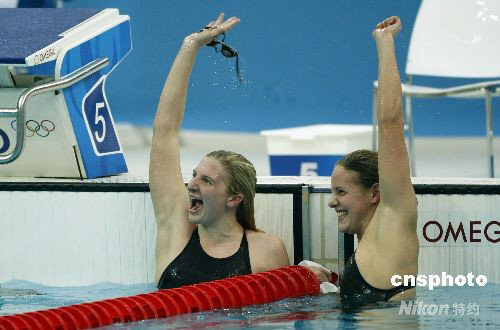 8月11日,北京奧運(yùn)會(huì)女子400米自由泳,英國(guó)選手麗貝卡 ·阿德林頓以4分3秒22的成績(jī)獲得冠軍(左),隊(duì)友喬安妮·杰克遜(右)以4分3秒52獲得銅牌。中新社發(fā) 杜洋 攝