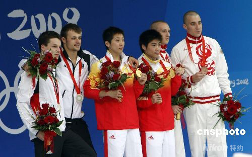 8月11日,中國(guó)“月亮組合”林躍(右)、火亮首次亮相奧運(yùn)大賽,獲得北京奧運(yùn)會(huì)男子10米雙人跳臺(tái)跳水金牌。這是當(dāng)天中國(guó)代表團(tuán)獲得的首枚金牌,也是中國(guó)代表團(tuán)在本屆奧運(yùn)會(huì)上獲得的第七枚金牌。林躍1991年出生,籍貫廣州潮州;鹆脸錾1989年,來自上海跳水隊(duì)。 中新社發(fā) 杜洋 攝
