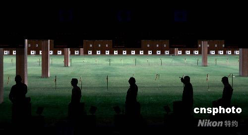 8月12日,北京奧運會男子50米手槍比賽在北京射擊館開戰(zhàn),譚宗亮和林忠仔代表中國射擊隊出戰(zhàn)。圖為男子50米手槍資格賽比賽現(xiàn)場。中新社發(fā) 盛佳鵬 攝