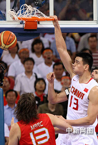 8月12日,北京奧運(yùn)會(huì)男子籃球小組賽第二輪賽事開賽,首戰(zhàn)負(fù)于“夢(mèng)八隊(duì)”的中國(guó)男籃在姚明率領(lǐng)下向世錦賽冠軍西班牙隊(duì)發(fā)起猛攻。圖為姚明大力扣籃。中新社記者 任晨鳴 攝