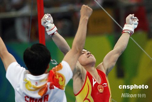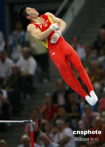 8月12日,中國隊在北京奧運會體操男子團體比賽中以286.125 分勇奪金牌。圖為李小鵬在單杠比賽中。 中新社發(fā) 武仲林 攝