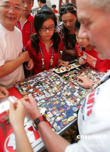 8月12日,眾多“國(guó)際級(jí)”紀(jì)念章收藏者在北京奧林匹克博覽會(huì)上擺攤兒,與前來(lái)歡享北京奧運(yùn)會(huì)的世界各地體育迷交換體育紀(jì)念章。象征著友誼的紀(jì)念章在奧林匹克的節(jié)日里——只換,不賣。中新社發(fā) 楊可佳 攝