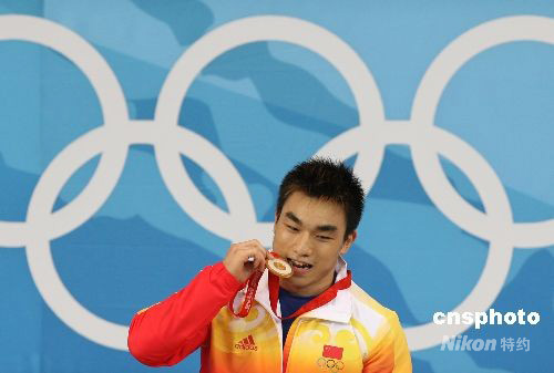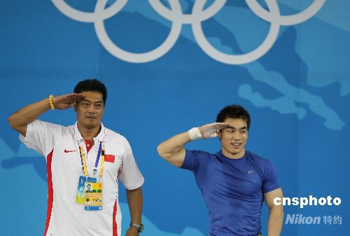 8月12日,中國選手廖輝在北京奧運(yùn)會男子舉重69公斤級比賽中以348公斤的總成績奪得冠軍。在賽后進(jìn)行的頒獎儀式上,獲得冠軍的中國小將廖輝一出場就博得了現(xiàn)場觀眾的陣陣掌聲,最終站上領(lǐng)獎臺的八一小將也再次以一個軍禮回敬了主場觀眾的支持。 中新社發(fā) 武仲林 攝