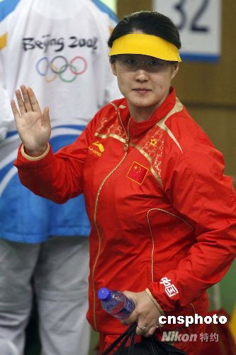 8月13日,北京奧運(yùn)會(huì)女子25米運(yùn)動(dòng)手槍資格賽在北京射擊館結(jié)束,中國兩名參賽選手費(fèi)逢吉與陳穎攜手晉級(jí)。其中陳穎的資格賽成績?yōu)?85環(huán),排名第三。費(fèi)逢吉為582環(huán),名列第七。圖為陳穎向觀眾揮手致意。中新社發(fā) 盛佳鵬 攝