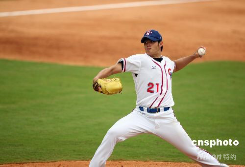 8月13日,中華臺(tái)北棒球隊(duì)在北京奧運(yùn)會(huì)棒球首場比賽中,以5:0完勝荷蘭隊(duì)。圖為中華臺(tái)北隊(duì)投手陳偉殷在比賽中。 中新社發(fā) 武仲林 攝