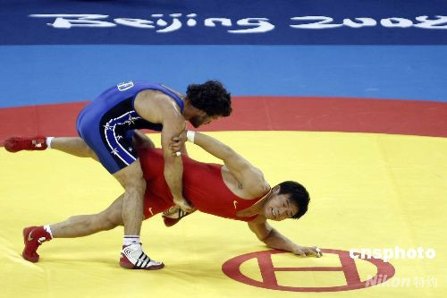 8月13日,北京奧運(yùn)會(huì)摔跤男子古典式74公斤級(jí)冠亞軍決賽中,中國(guó)選手常永祥(紅)不敵格魯吉亞選手馬努恰爾·克維克利亞,獲得銀牌。這枚銀牌也創(chuàng)造了中國(guó)男子摔跤隊(duì)在奧運(yùn)會(huì)比賽的最佳成績(jī)。 中新社發(fā) 盛佳鵬 攝
