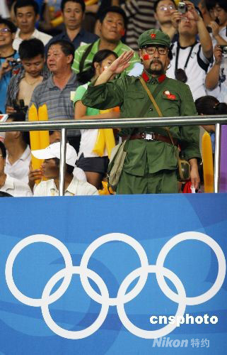 8月13日,北京奧運(yùn)會(huì)男子足球賽,中國對(duì)巴西的比賽在秦皇島奧體中心舉行,最終中國隊(duì)0:3負(fù)于巴西隊(duì)。圖為一位身著老式“軍裝”的球迷亮相秦皇島奧體中心。 中新社發(fā) 劉新 攝