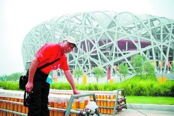 鐘自奇在鳥巢附近檢查焰火產(chǎn)品。鐘勇攝