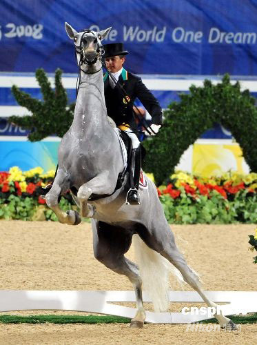 八月十四日晚,奧運(yùn)馬術(shù)盛裝舞步團(tuán)體賽及個(gè)人賽在香港沙田賽場舉行,并決出兩面金牌。葡萄牙選手米格爾·拉朗·杜阿爾特在比賽時(shí)坐騎“半月形的酢漿草”陣上失控起擒退出比賽。 中新社發(fā) 鄧慶樂 攝
