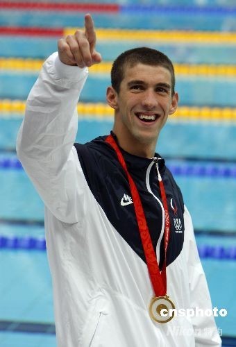 8月15日上午,在國(guó)家游泳中心水立方舉行的北京奧運(yùn)會(huì)男子200米混合泳中,美國(guó)選手菲爾普斯續(xù)寫(xiě)神話,再次打破世界紀(jì)錄獲得冠軍,收取他在本屆奧運(yùn)的第六枚金牌,使得他在奧運(yùn)會(huì)上獲得的金牌總數(shù)達(dá)到12枚。中新社發(fā) 杜洋 攝
