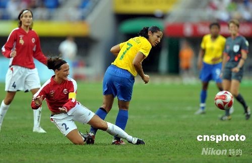 8月15日,奧運(yùn)女足四分之一決賽在天津奧體中心水滴體育場舉行,由挪威女足對陣巴西隊(duì),巴西上半時(shí)7號丹尼埃拉領(lǐng)先一球。中新社發(fā) 陳文 攝