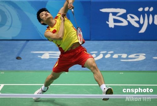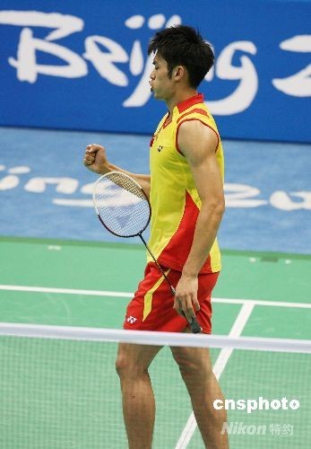 8月15日,中國(guó)選手林丹在北京奧運(yùn)會(huì)羽毛球男子單打半決賽中以2比0戰(zhàn)勝隊(duì)友陳金,進(jìn)入決賽。中新社發(fā) 武仲林 攝