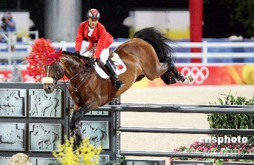 八月十五日晚,在香港沙田主場館進行的奧運馬術場地障礙個人賽上,中國選手李振強策馬飛躍障礙。當日,中國馬術代表隊四名選手首度亮相,參加場地障礙賽個人賽第一輪資格賽。中新社發(fā) 洪少葵 攝