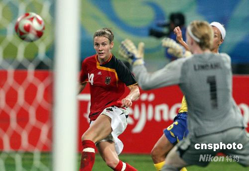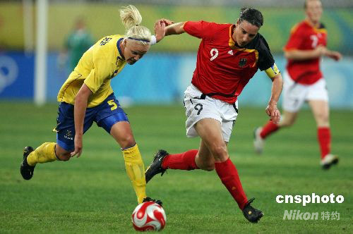 8月15日,北京奧運會沈陽足球分賽場舉行女足1/4決賽,德國隊?wèi){借加時賽,以2:0戰(zhàn)勝瑞典隊,進(jìn)入半決賽。中新社發(fā) 張宇 攝