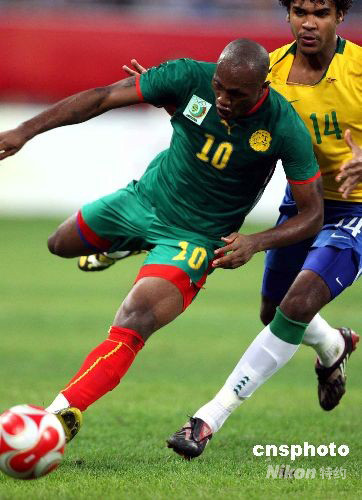 8月16日,北京奧運會沈陽足球分賽場舉行男足1/4決賽,巴西對陣喀麥隆。圖為喀麥隆隊員貝卡芒加(綠衣)帶球。中新社發(fā) 張宇 攝