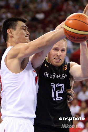 8月16日,北京奧運(yùn)會(huì)男子籃球小組賽第四輪比賽在五棵松籃球館舉行,最終由姚明率領(lǐng)的中國(guó)隊(duì)?wèi)?zhàn)勝由諾維斯基、卡曼率領(lǐng)的德國(guó)隊(duì),挺進(jìn)8強(qiáng)。中新社發(fā) 任晨鳴 攝