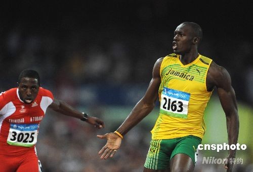 8月16日晚,牙買加選手尤塞恩·博爾特在中國國家體育場“鳥巢”進(jìn)行的北京2008年第二十九屆奧運(yùn)會(huì)男子100米決賽中,以9秒69的成績奪得金牌并打破9秒72的世界紀(jì)錄。中新社發(fā) 古玉 攝