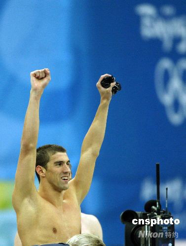 8月17日,美國隊(duì)獲得北京奧運(yùn)會男子4乘100米混合泳接力冠軍,至此,23歲的美國游泳運(yùn)動員菲爾普斯不僅用8金刷新了單屆奧運(yùn)會金牌紀(jì)錄,而且還將個人所有奧運(yùn)會的金牌總數(shù)提高到了14枚,達(dá)成了他人難以超越的“世界紀(jì)錄”。 中新社發(fā) 杜洋 攝