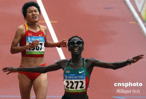 8月17日,在北京奧運會女子馬拉松決賽中,中國選手周春秀(右)以二小時二十七分零七秒的成績奪得銅牌;另一名中國選手朱曉琳獲得第四名。