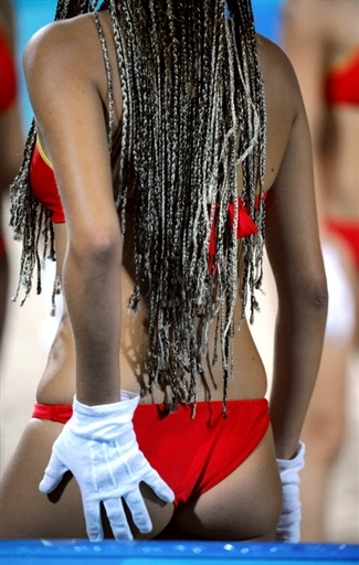 沙排場地上,一個(gè)發(fā)型前衛(wèi)的啦啦隊(duì)員惹火的背影。