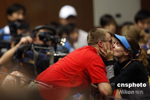 此圖為奧運會開賽首日卡特琳娜射落首金后,丈夫埃蒙斯送吻慶祝。