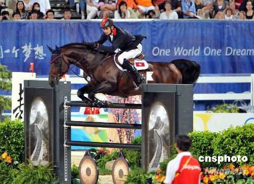 中國(guó)香港選手林立信在馬術(shù)場(chǎng)地障礙賽第二輪資格賽再度登場(chǎng)。中新社發(fā) 鄧慶樂(lè) 攝