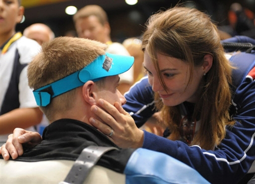 同樣的悲劇以同樣的方式,降臨到同一個(gè)人身上。在今天男子50米步槍3×40決賽的最后一輪,只要打出8環(huán),埃蒙斯就能奪冠。槍響了。4.4環(huán)!埃蒙斯把頭埋在妻子卡特琳娜的懷里,淚洗臉龐。那顆英雄的心上留下第二個(gè)悲情的彈孔。