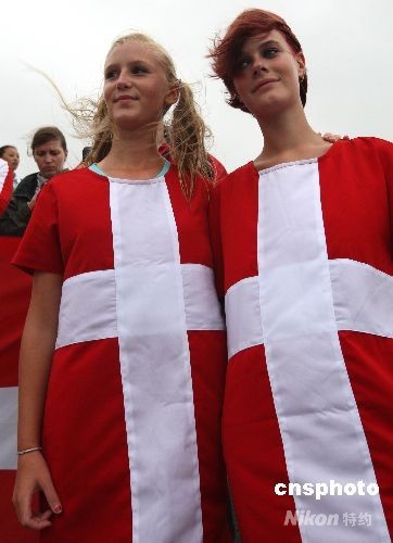 身著國旗圖案服裝的丹麥美女拉拉隊現(xiàn)場格外引人注目。中新社發(fā) 趙振清 攝