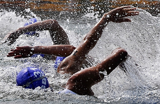 8月18日,北京奧運(yùn)會(huì)鐵人三項(xiàng)賽,運(yùn)動(dòng)員在進(jìn)行游泳項(xiàng)目的比賽時(shí),場(chǎng)面頗似舞蹈“千手觀音”。
