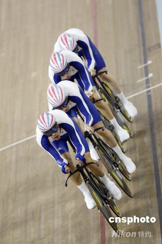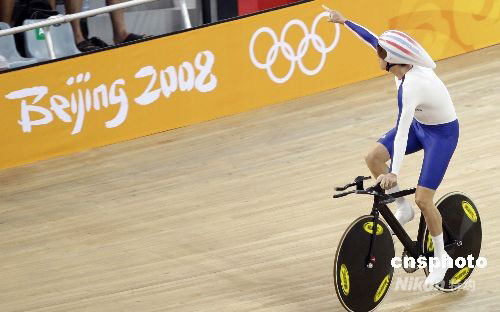 8月18日,北京奧運(yùn)會場地自行車男子4公里團(tuán)體追逐賽決賽在老山自行車館舉行,英國隊(duì)以3分53秒314的成績獲得金牌,打破世界紀(jì)錄。 中新社發(fā) 盛佳鵬 攝