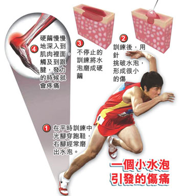 對于劉翔的教練孫海平指劉翔因其腳跟的骨較正常人突出而令其右腳跟腱部易于發(fā)炎,陸家美指“就高水平的運動員來說,身體有勞損是在所難免,而在短跑如100米及110米欄的運動員來說更是常見!