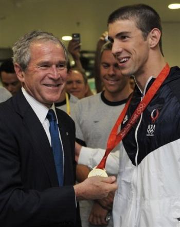 美國總統(tǒng)布什接見菲爾普斯時(shí)喜笑顏開。