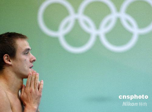 8月19日,北京奧運會男子3米板半決賽在“水立方”進行,來自加拿大的選手魯本·羅斯在起跳前祈禱動作成功。 中新社發(fā) 杜洋 攝