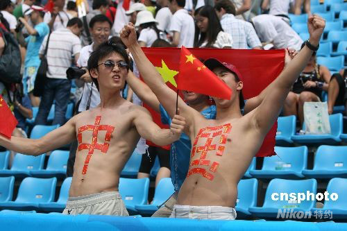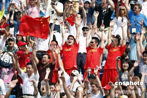 8月19日,女子沙灘排球半決賽第51場(chǎng)在北京朝陽(yáng)公園沙灘排球場(chǎng)進(jìn)行。中國(guó)選手王潔、田佳2:1戰(zhàn)勝同門(mén)師妹薛晨、張希晉級(jí)決賽。圖為激情球迷現(xiàn)場(chǎng)助威。 中新社發(fā) 武仲林 攝