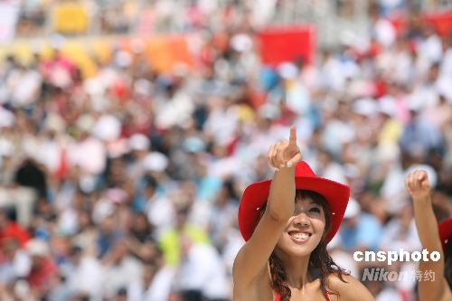 圖為沙灘排球?qū)氊惉F(xiàn)場為選手助威。 中新社發(fā) 武仲林 攝